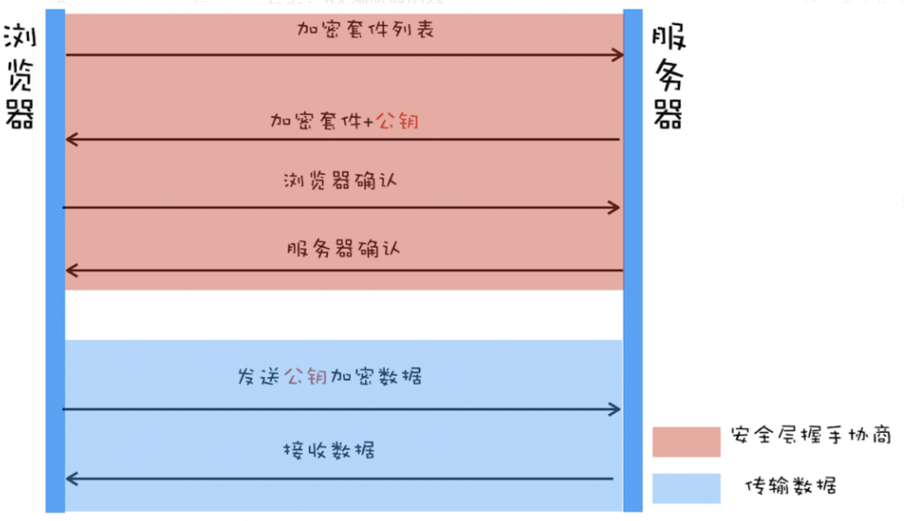 - 然后服务器会选择一个加密套件,将加密套件和公钥一道发送给浏览器。(不过和对称加密不同的是,使用非对称加密时服务器上需要有用于浏览器加密的公钥和服务器解密 HTTP 数据的私钥)
