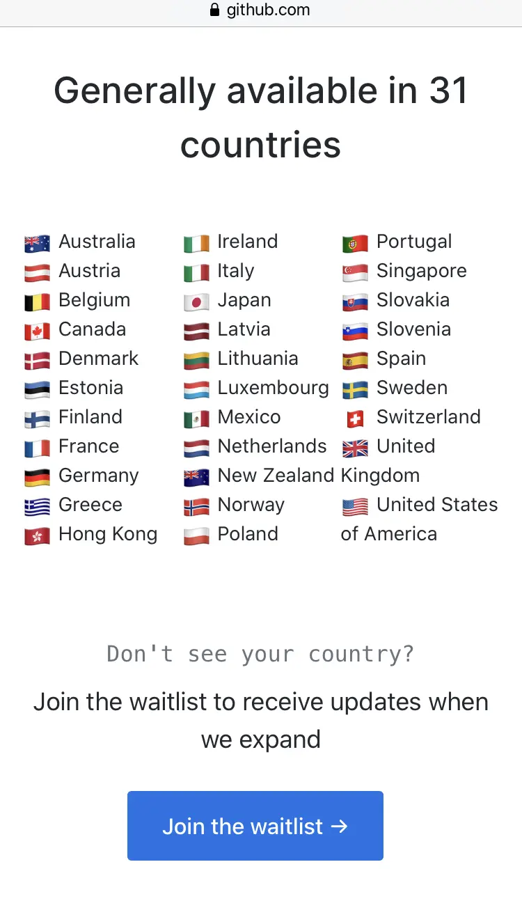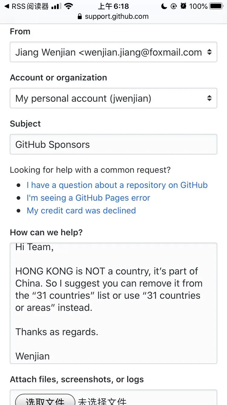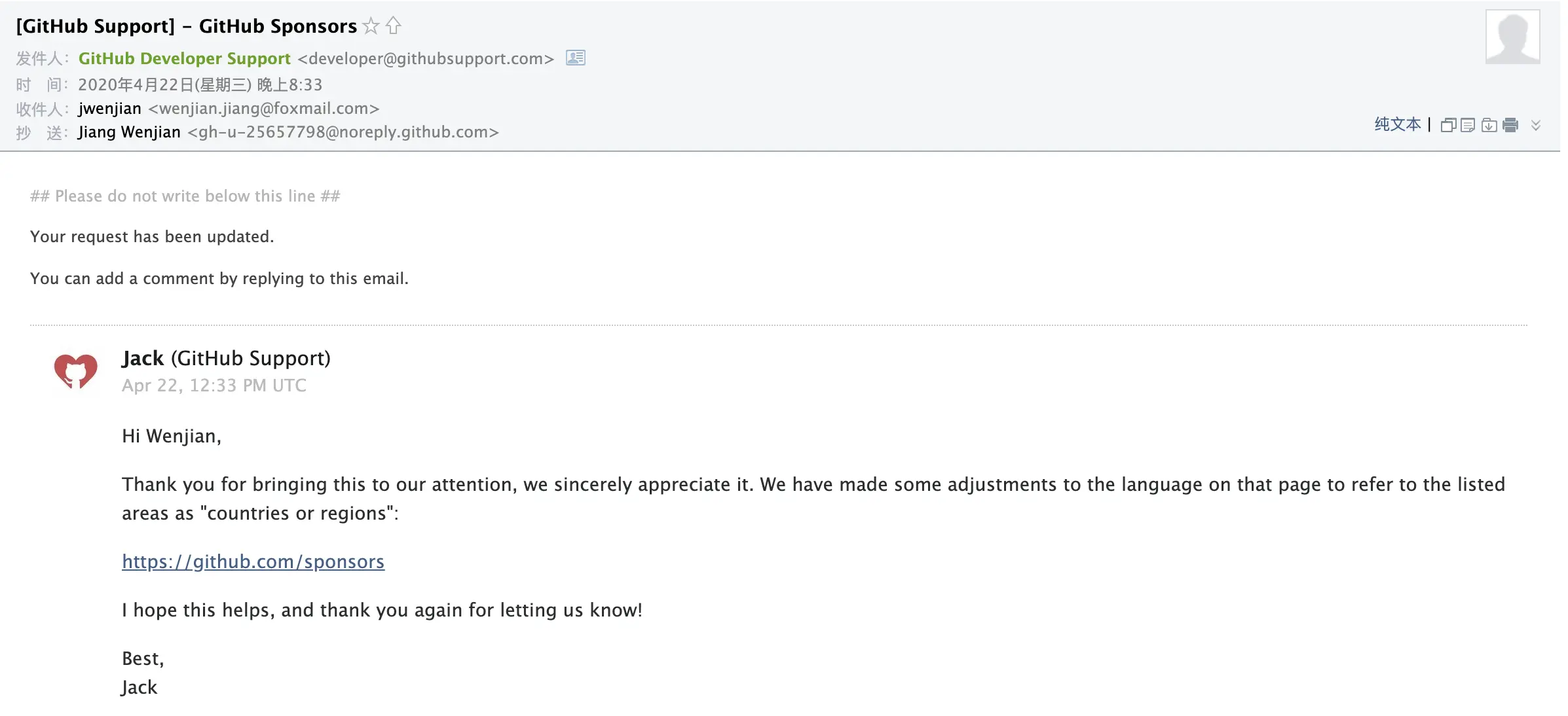 今天,收到了 GitHub Support 工程师 Jack 的回复,对于我提出的反馈表示感谢并且表示已经将原来的 “countries” 修改为了 “countries or regions”: