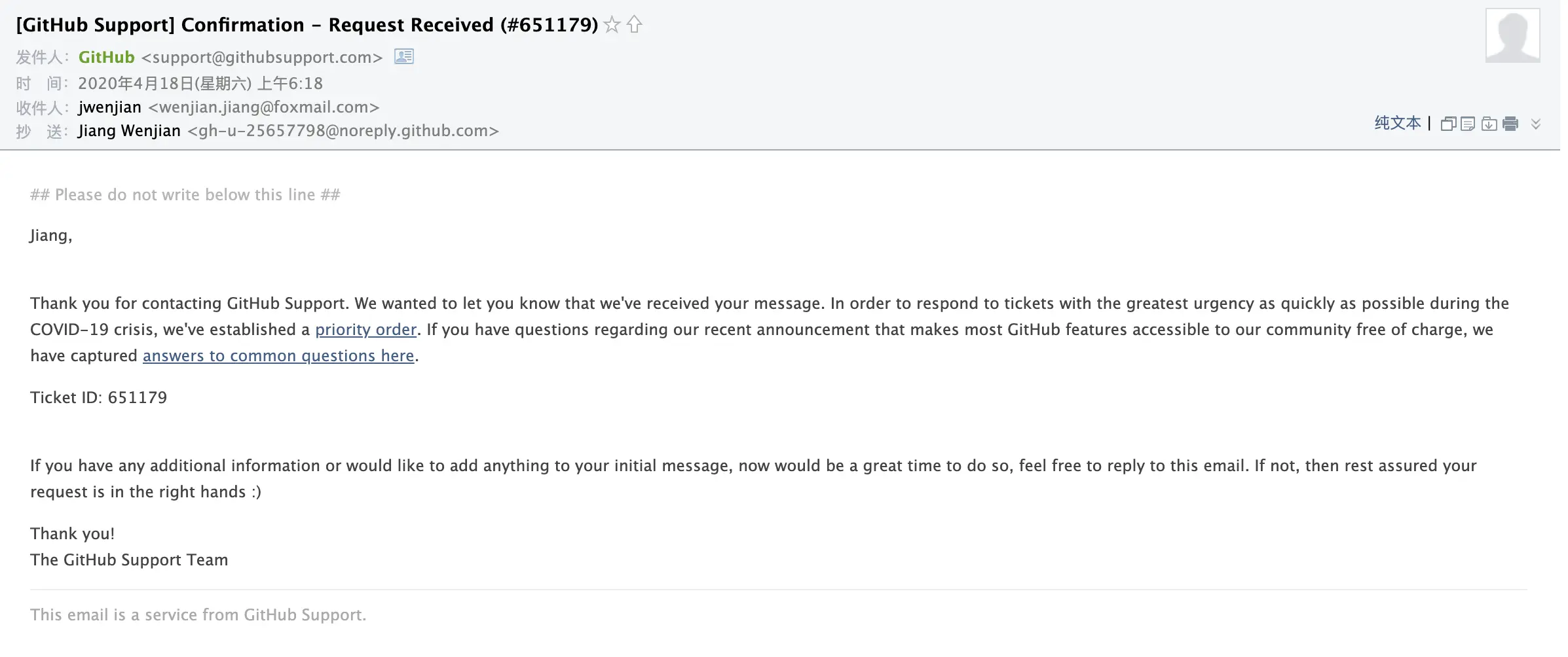 随后不久,邮箱里收到了 GitHub ticket 创建成功的回复: