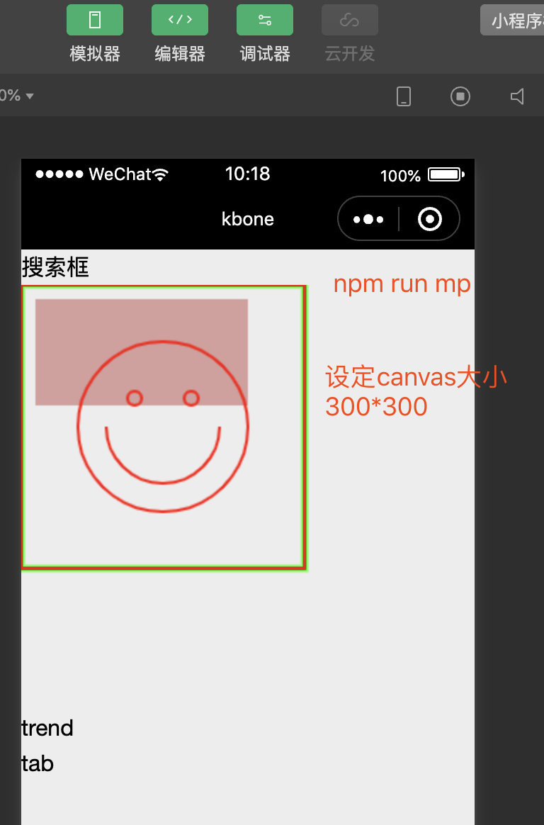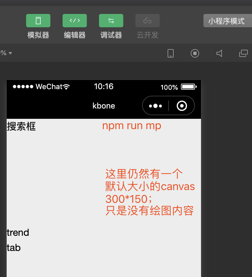 miniprogram里没有显式定义宽高的情况下,虽然默认宽高也是300**150,但是画布空白(这一点kbone可以做到才对,计划有时间就去看下这个问题):
