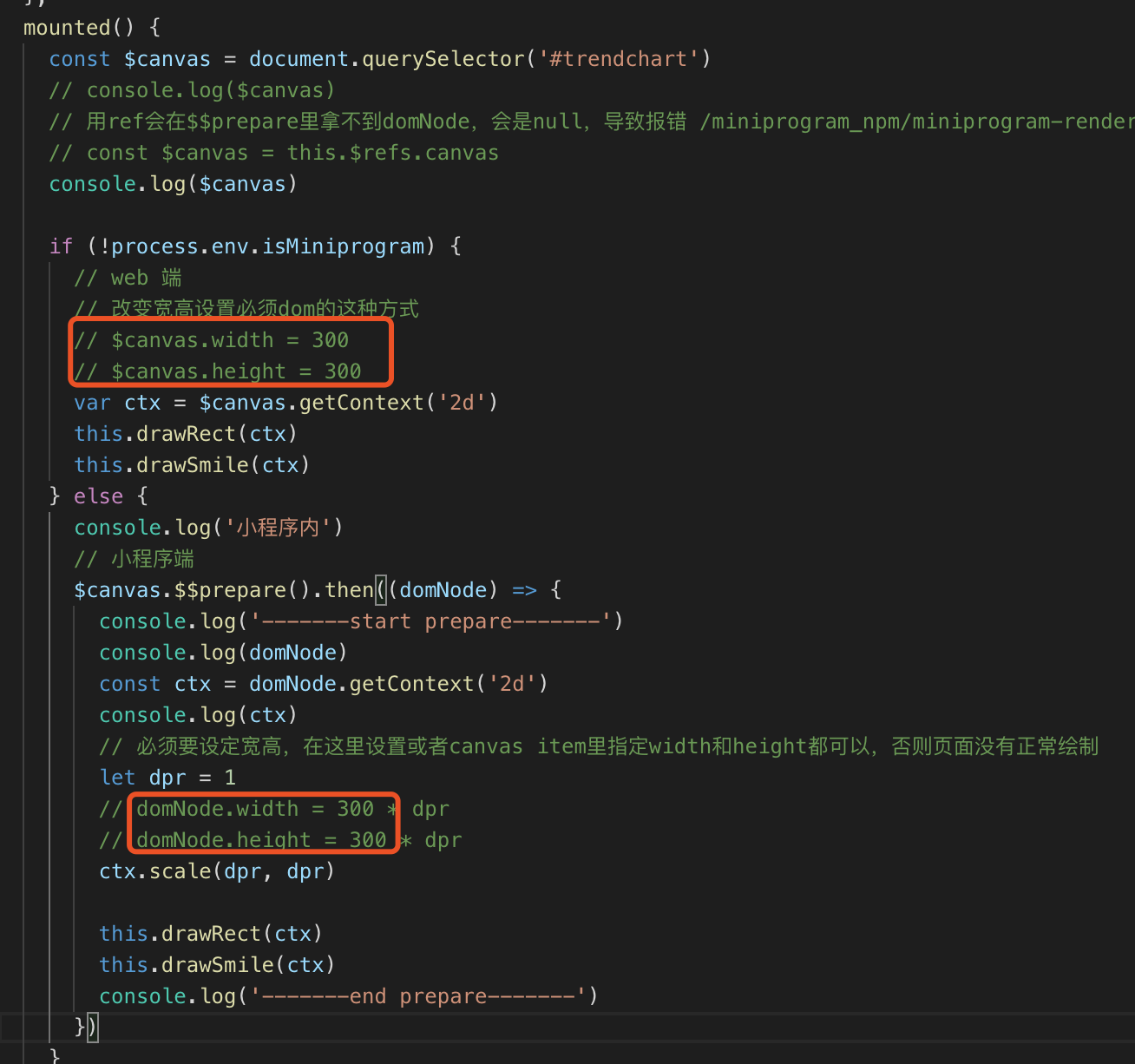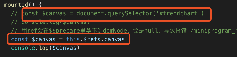 通过ref获取,可以看到web是没有问题的,和用id获取是一致的。但是mp里,曾经遇到过canvas.js里res节点为null的问题,即?prepare回调函数的参数domNode为null。但是后面再跑又莫名消失了。尚未定位原因。