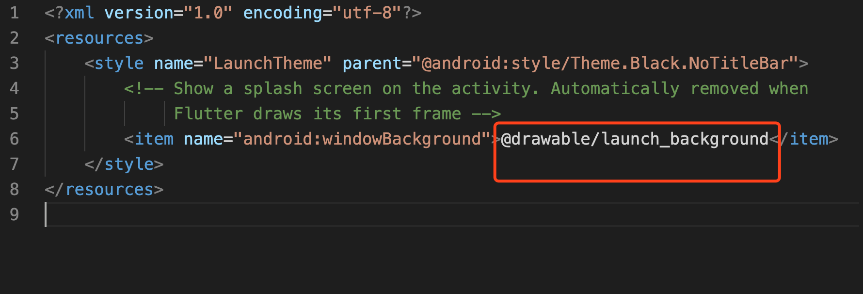 <?xml version="1.0" encoding="utf-8"?><resources> <style name="LaunchTheme" parent="@android:style/Theme.Black.NoTitleBar"> <!-- Show a splash screen on the activity. Automatically removed when Flutter draws its first frame --> <item name="android:windowBackground">@drawable/launch_background</item> </style></resources>红色框框部分保持跟步骤一文件名相同就行, 默认就是这样的