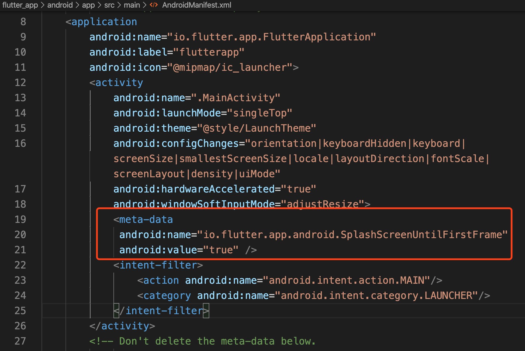 <meta-data android:name="io.flutter.app.android.SplashScreenUntilFirstFrame" android:value="true" />如图所示