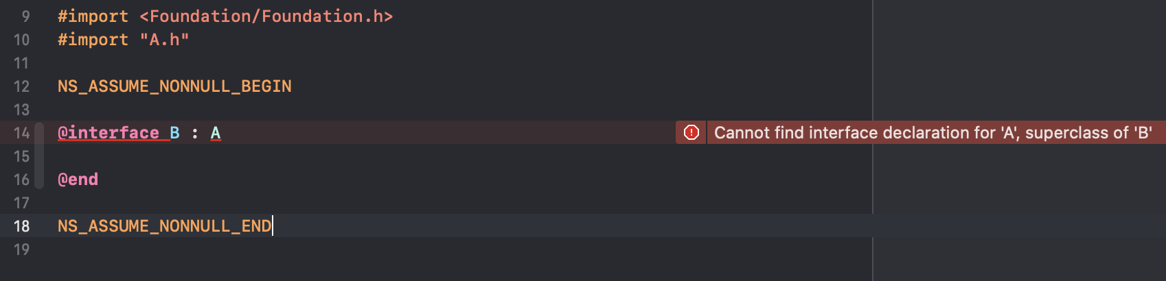 这时候编译器报错了,"Cannot find interface declaration for 'A', superclass of 'B'"