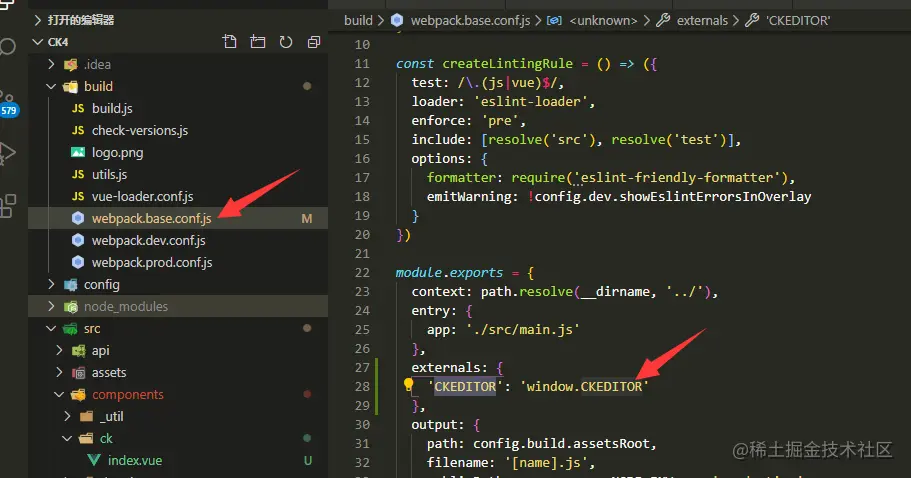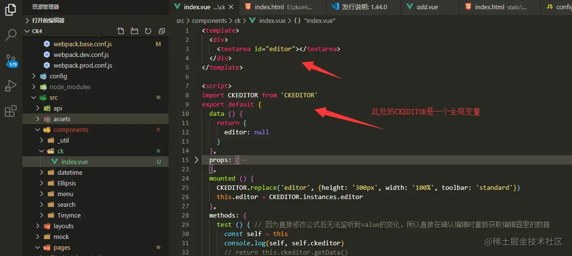 3.由于需求全局变量,所以需要在项目中配置了CKEDITOR,如图所示(后续需要使用)