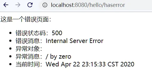 可以在我们错误页面中获取到如下信息(就是ModelAndView对象中的内容):