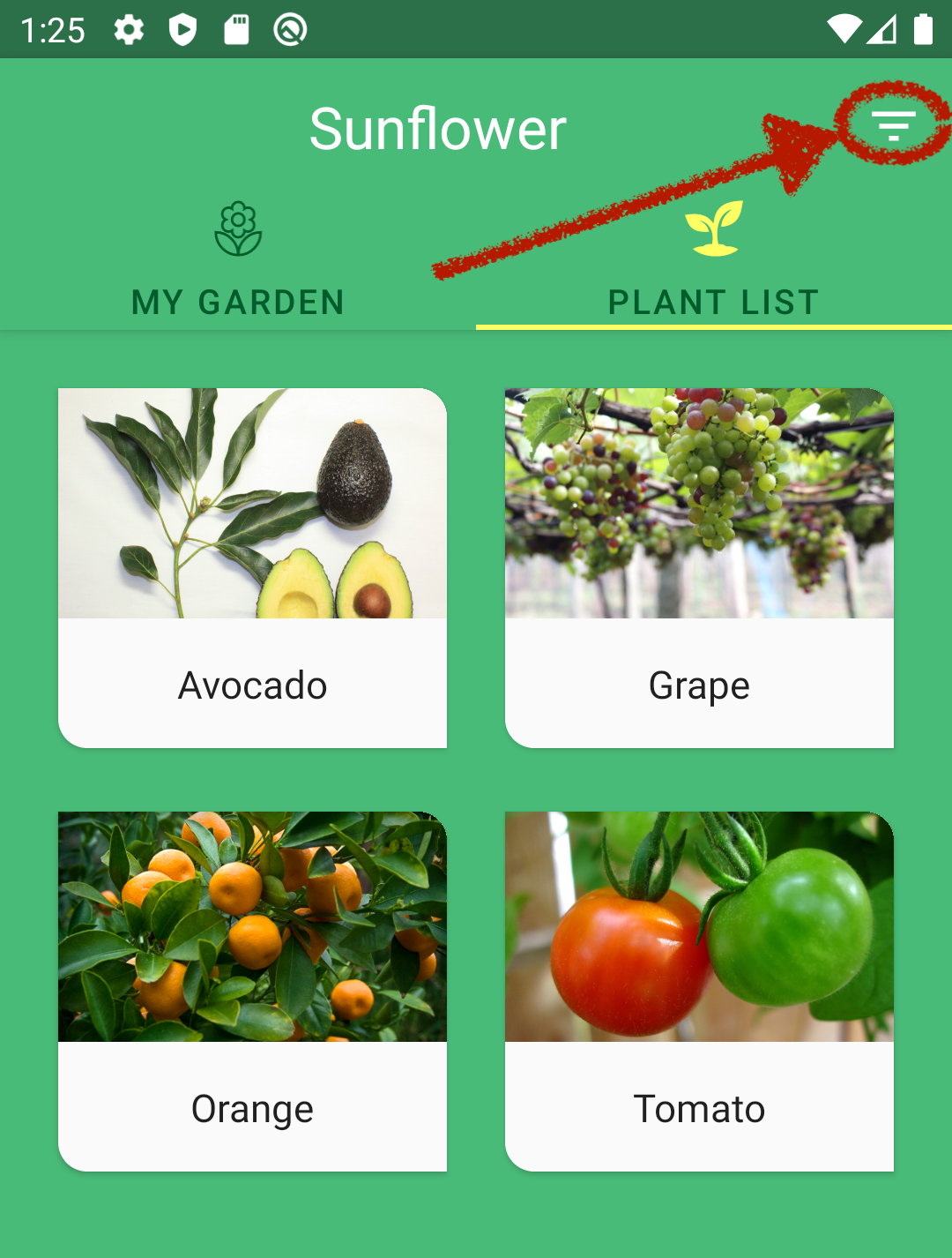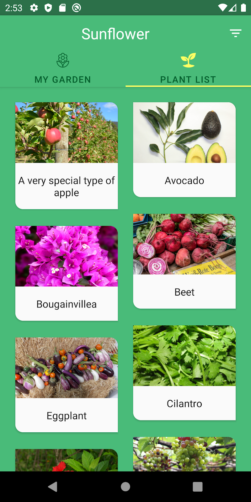 Sunflower App 的 UI 包含两个选项卡。要将一些植物添加到我的花园中,我们看一下 "Plant List" 选项卡,其中列出了我的花园中可用的植物。在右上角有一个过滤器按钮。当我按下此按钮时,将显示以下植物列表: