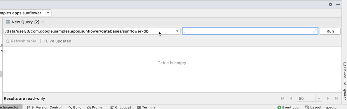 另外,我可以键入自己的查询并在工具窗口中运行它。这给了我更多的可选择性,因为我不仅限于在 DAO 接口中定义的查询。要运行自己的查询,请单击 “Run SQL”,然后从右侧新打开的选项卡中选择 plants 数据库。