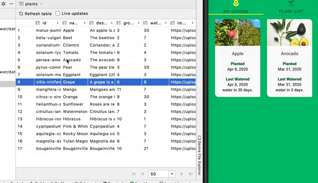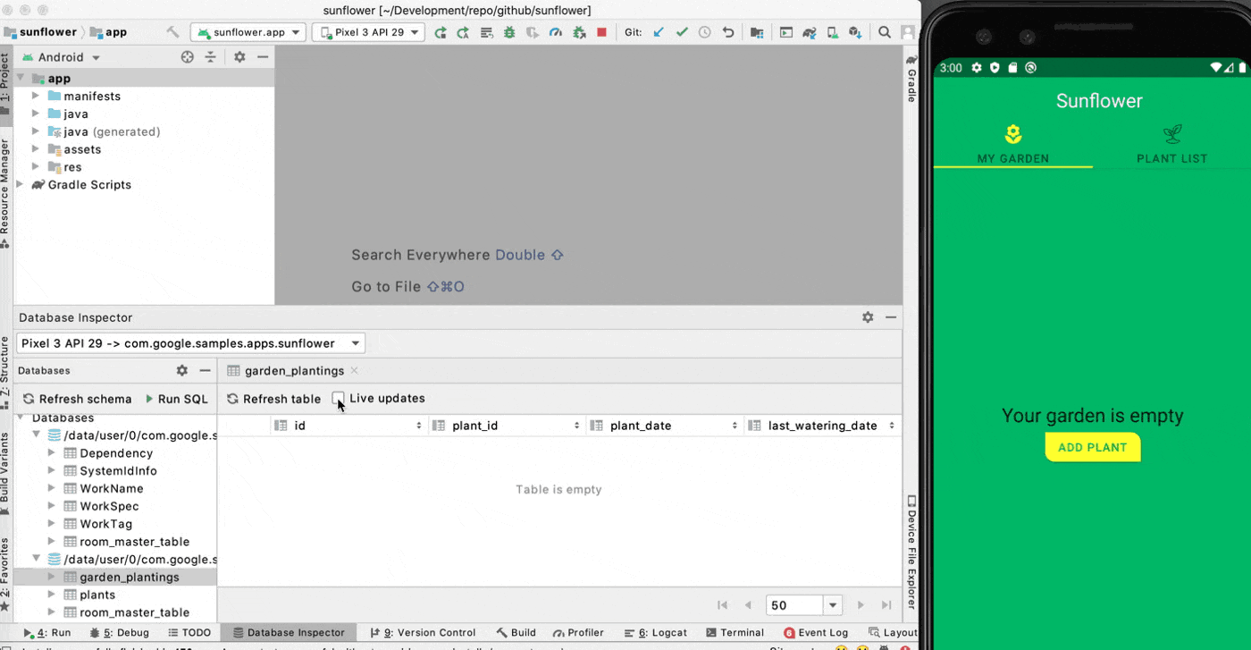 每个植物都有不同的浇水间隔,我想看看何时浇水到期。为此,我需要在花园里添加一些植物。但是首先,我在数据库检查器中选中了 Live updates 复选框。当 Live updates 检查,数据库检查自动显示任何改变你的应用程序,使得它的数据库。