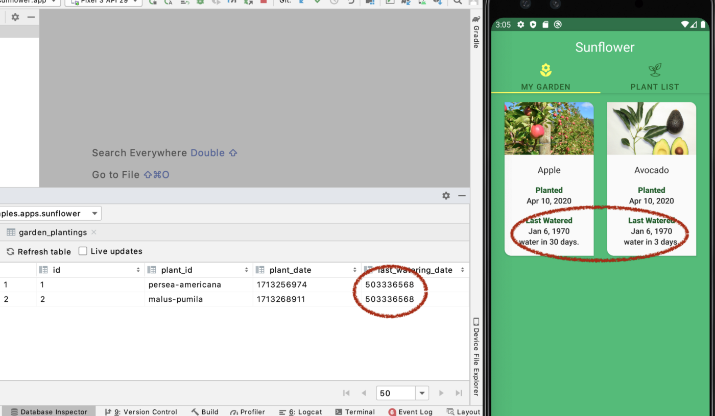 这两种植物的浇水间隔均为 3 天。我真的不想等待 3 天才能看到会发生什么,所以我将编辑数据库并更改 last_watering_day。我再次回到 Database Inspector,然后双击 garden_plantings。该 last_watering_date 是表的最后一栏。我将两个记录的值更改为较小的值,以反映今天的某个日期之前的某个时间。