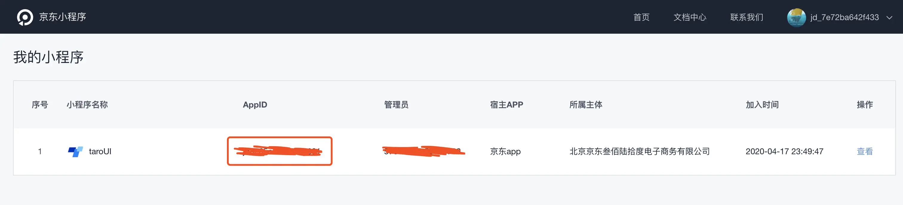 当进行了上面的配置之后,并把项目开起来之后,这个时候我们就需要去注册一个京东小程序,拿到对应的小程序的 AppId ,你可以访问京东小程序官网,根据步骤注册小程序,并创建项目,然后取到项目的 AppId ,类似如下: