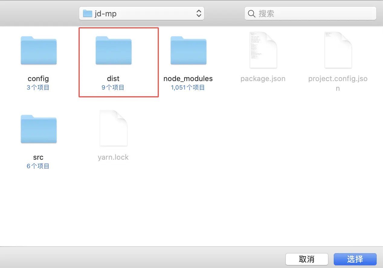 并在京东开发者里面点击上面圆圈圈出的那个文件夹图标,打开上面创建的 jd-mp 项目,不过请注意,我们需要选中项目里面编译好的 dist 目录: