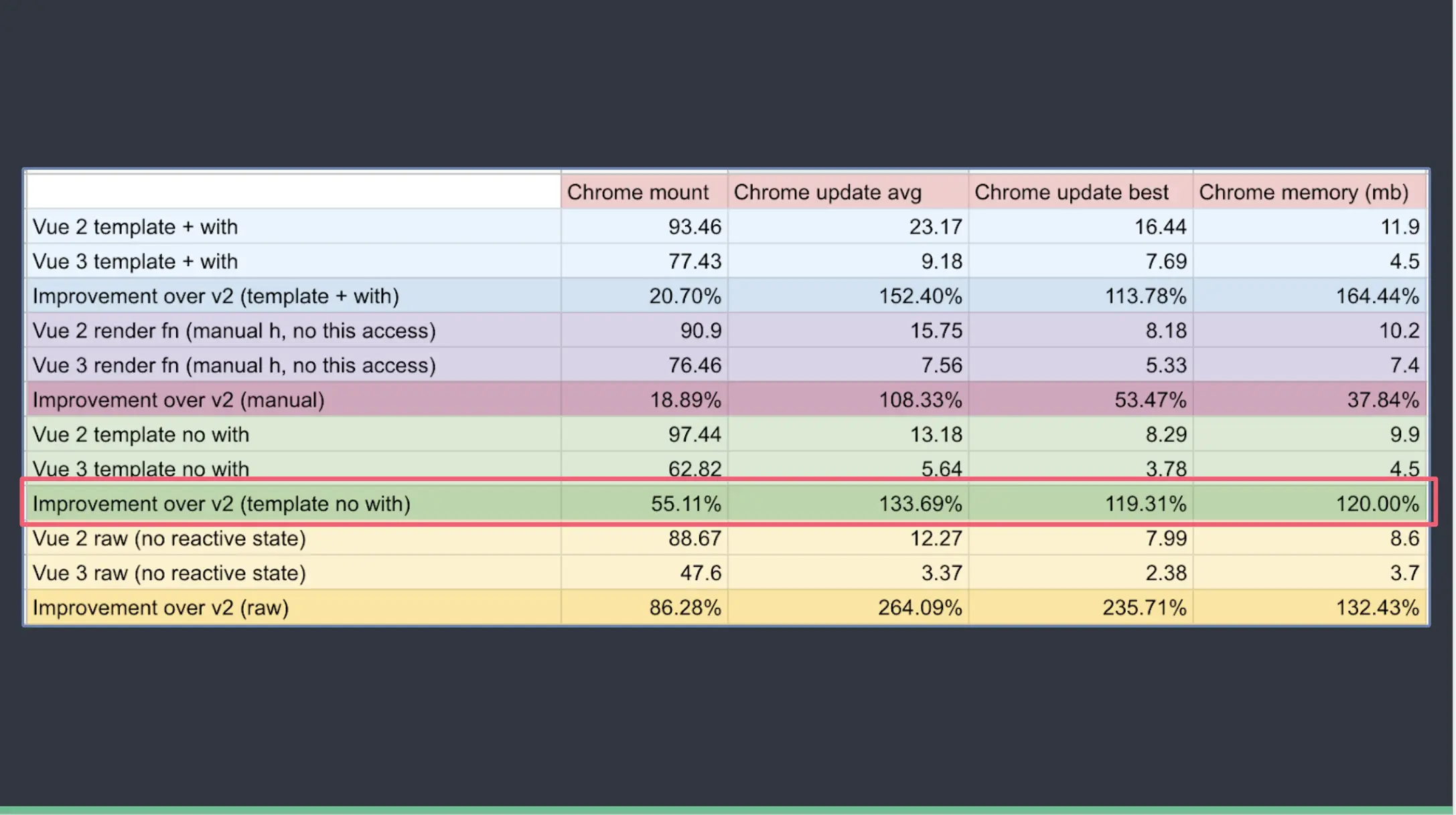 整体上,比Vue 2.x 内存占用少一半以上,总体速度快一倍以上。