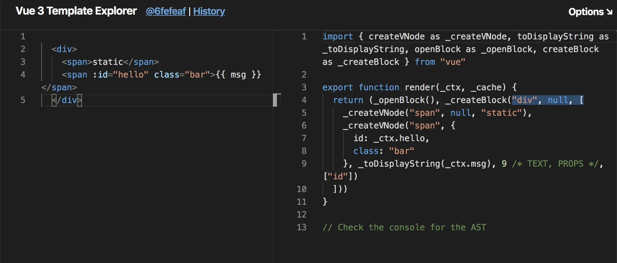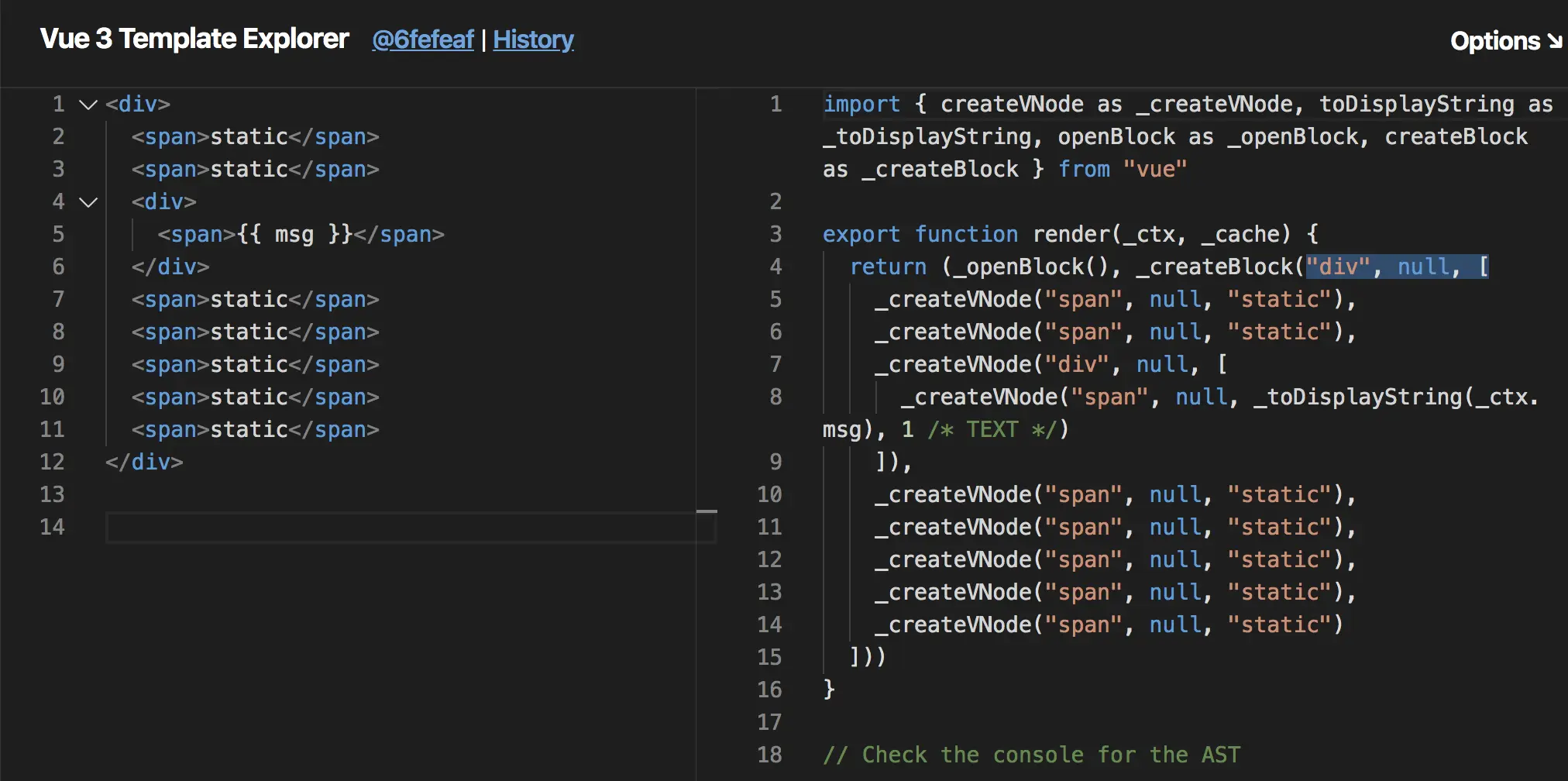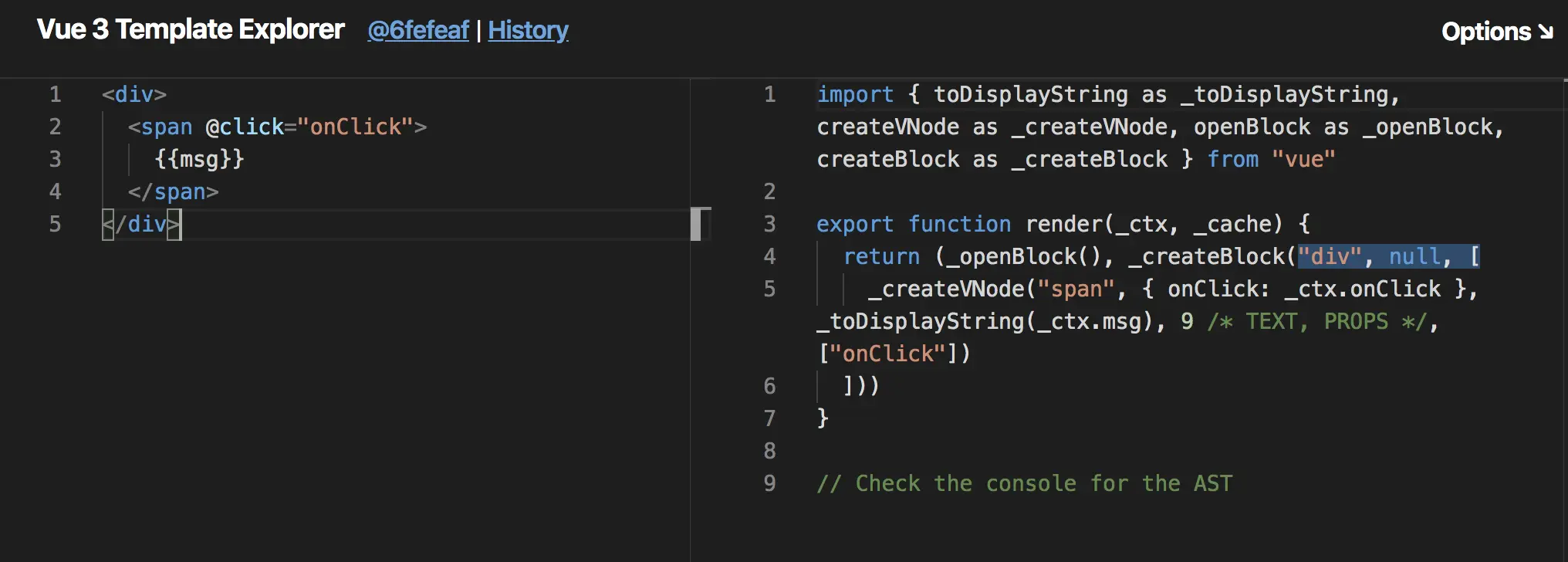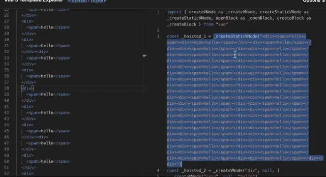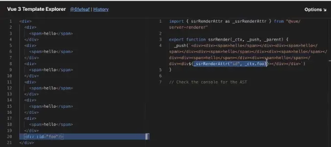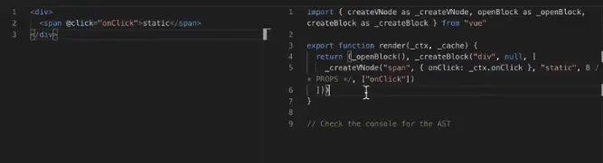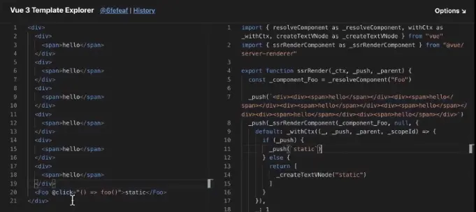 可以通过点击vue-next-template-explorer进入视频中模板编制的Playgruond。其永远和vue3.0 github上master最新的commit保持一致