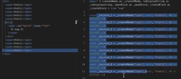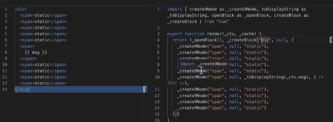 动态绑定msg属性的span,编译后_createVNode会生成PacthFlag(相当于编译时生成一个hint),JS runtime在运行的时候,会知道div是一个block,只会对带有PacthFlag的结点进行真正的追踪。在真正的更新的时候,会直接跳到该结点,比较该结点文字的变化。不需要去关注其他属性和绑定的变化。