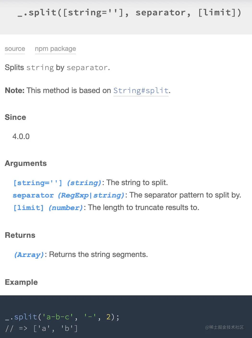 split方法把这个string分割成片段来创建一个字符串数组。可选参数limit可以限制被分割的片段数量。separator参数可以是一个字符串或一个正则表达式。如果
