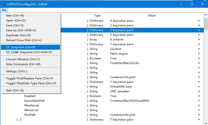 ProperTree为我们提供了非常快捷的预处理操作,点击左上角File-OC SnapShot自动加载kexts、drivers和DSDT到config文件中