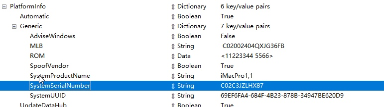 - PlatformInfo:记录了平台信息,也就是模拟的Mac的型号、序列号、UUID等,在洗白和开启显卡硬解等步骤中很重要