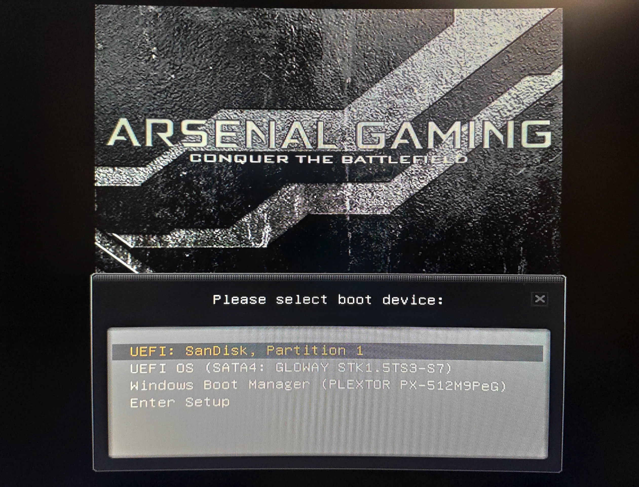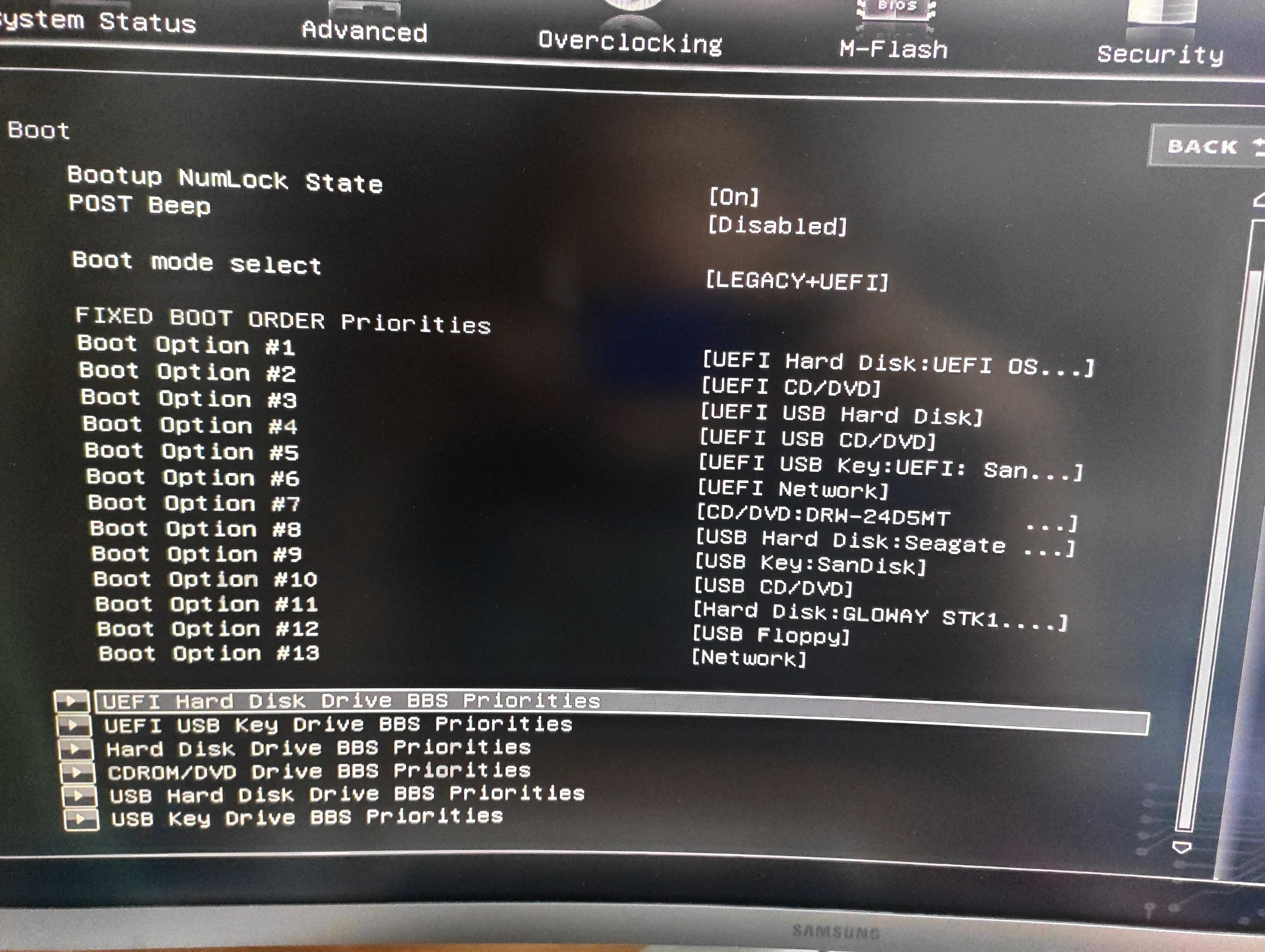 - 至此,我们的OpenCore已经可以从硬盘启动了。不过还需要调整一下BIOS中的UEFI分区启动优先级,每个主板的调整方式不同,迫击炮的是在这个选项卡中:
