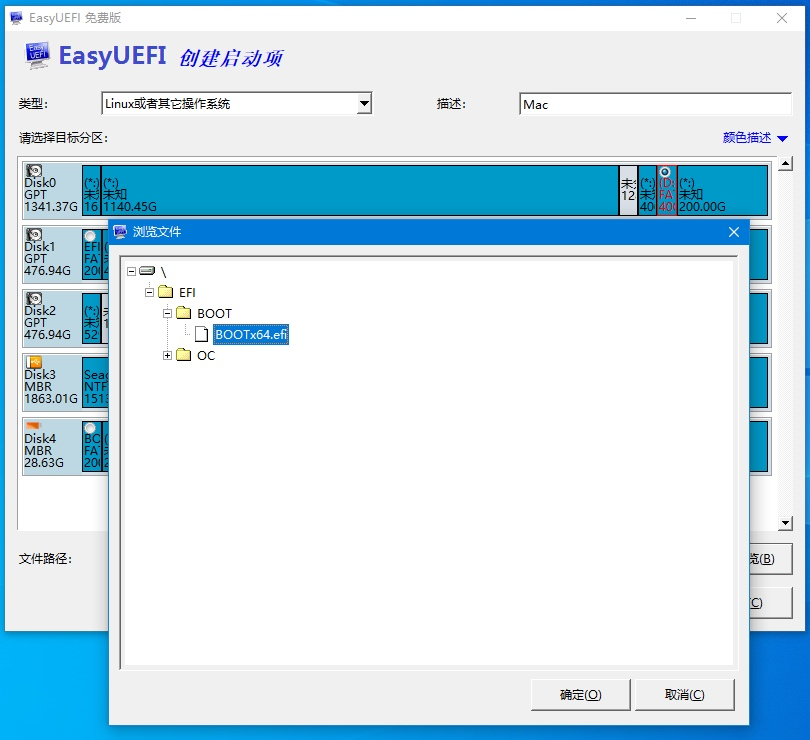 - 以管理员权限运行EasyUEFI,点击新增(中间那一栏有加号的那个图标),按图示选择新建立的EFI分区并选中相应的启动程序即可