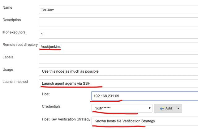 - Remote root directory 是你的在web服务器上的工作根目录。我这里用root登录,把工作目录放在/root/jenkins下。