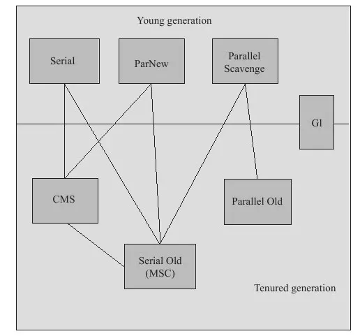 上面的表示是年轻代的垃圾回收器:Serial、ParNew、Parallel Scavenge,下面表示是老年代的垃圾回收器:CMS、Parallel Old、Serial Old,以及不分老年代和年轻代的G1。之间的相互的连线表示可以相互配合使用。