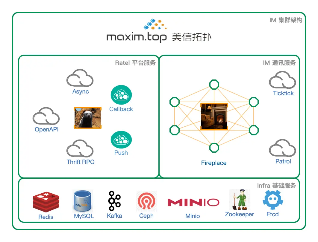 - Infra 基础设施服务,包括数据库 MySQL、缓存/快速存储 Redis、队列服务 Kafka、文件服务 Ceph/Minio、高可用存储 Zookeeper、Etcd;