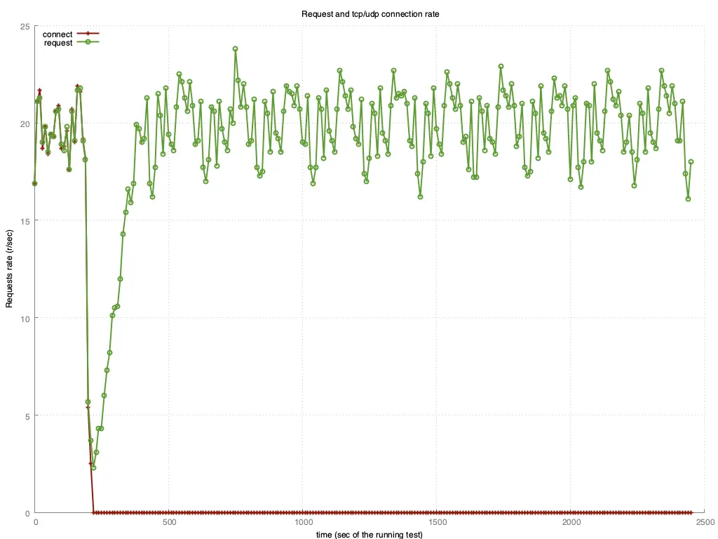 这条曲线,相信做过服务端的同学都会泪流满面。连接曲线和统计曲线重合在一起,意味着所有请求都被即时地处理了。
