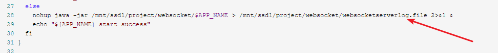 28 nohup java -jar /mnt/ssd1/project/websocket/$APP_NAME > /mnt/ssd1/project/websocket/websocketserverlog.file 2>&1 &