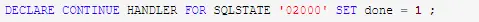 DECLARE CONTINUE HANDLER FOR SQLSTATE '02000' SET done = 1 ;