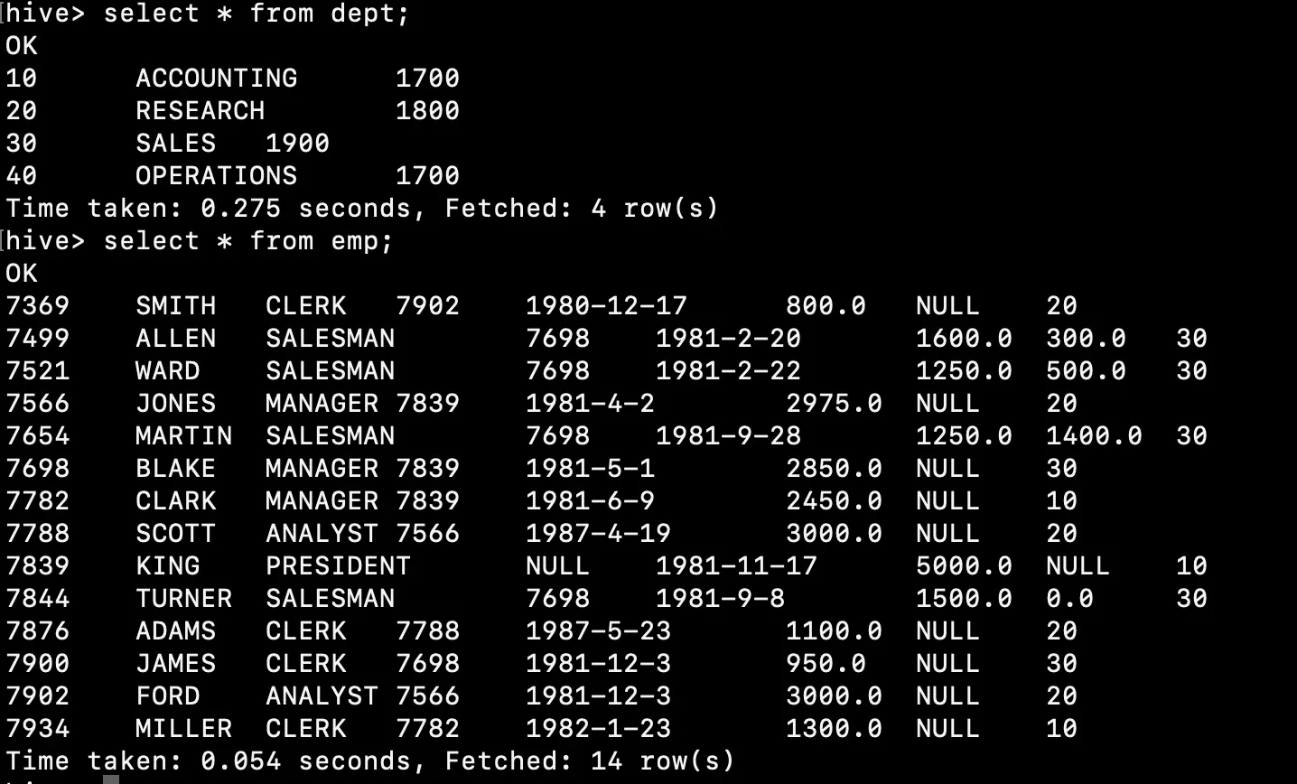 load data local inpath '/root/empdata.txt' into table emp;
