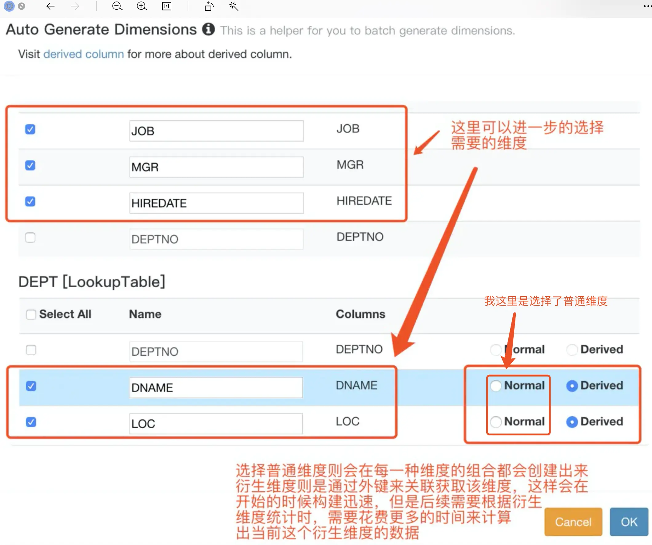 Mandatory Dimensions: 强制维度,现有a、b、c,3个维度,总共有7种组合,当a为Mandatory Dimensions时,那么,只有a维度或者包含a维度的组合才会被构建cubeid,即a、ab、ac、abc四种