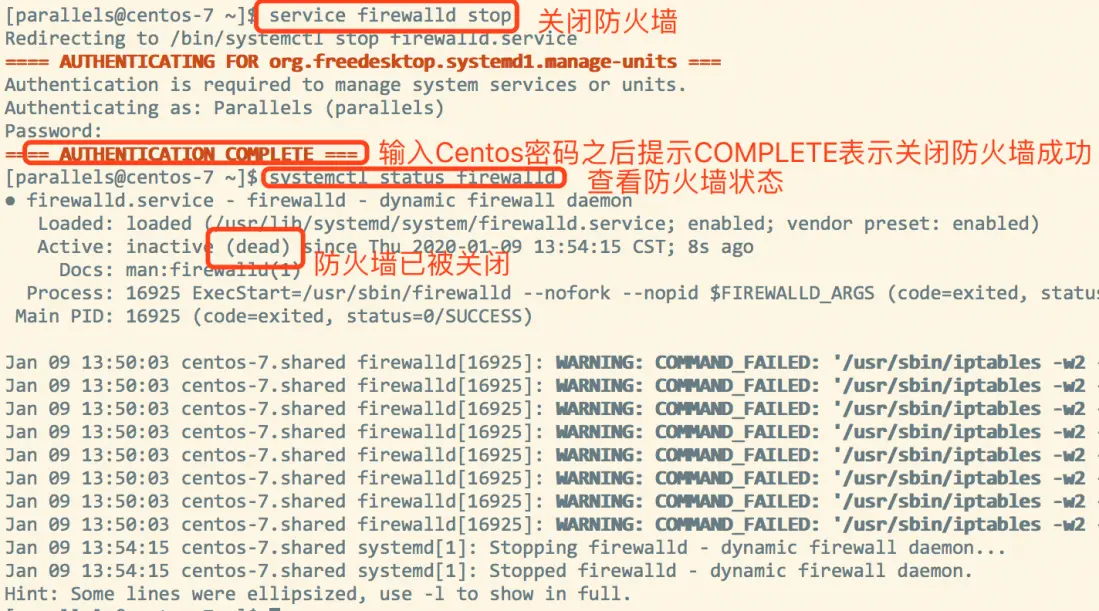 注意:如果上述关闭失败,提示==== AUTHENTICATION FAILED ===,只需在前面加上sudo,即:
