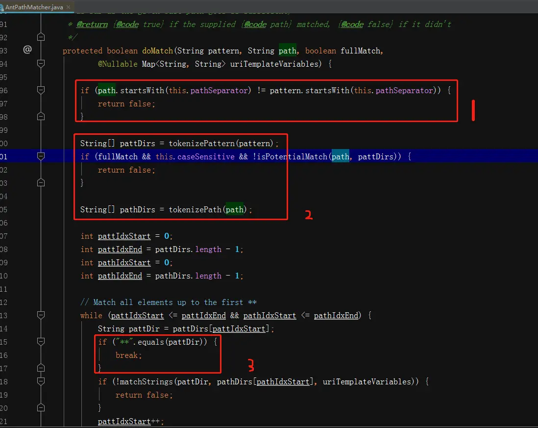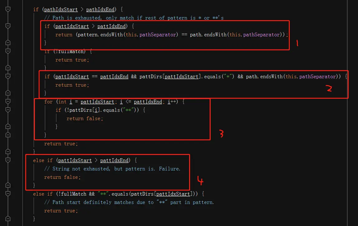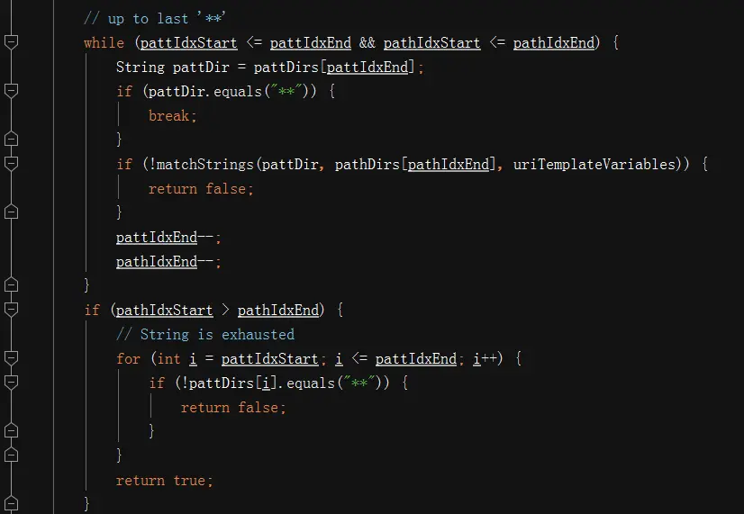 1 .如果path分词数组正常执行完毕,则pathIdxStart是会比pathIdxEnd大1的,这个时候,如果pattern的字符串数组也正常耗尽,则来判断pattern和path的最后一个字符是否同步,按结果返回;