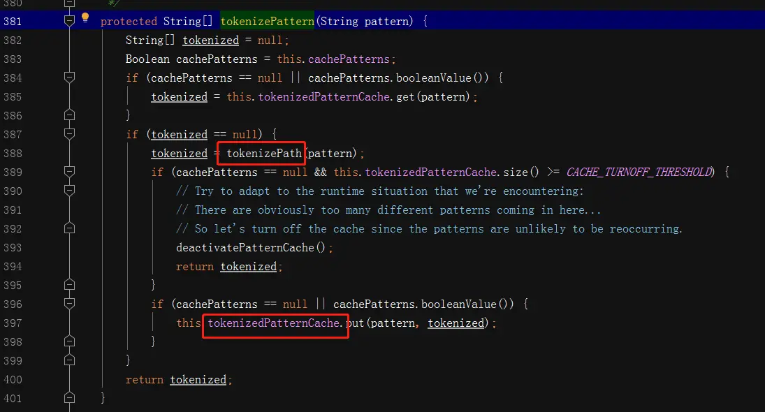 对pattern和path进行分词的逻辑是一样的,只是pattern做下缓存的处理; key为pattern,value为分次之后的字符串数组,每次先到cache获取,没有的话则计算,然后放入到cache里边,这样在做频繁的url mapping的时候,由于规则是有限的,可以很大程度减少计算; 当超过缓存的最大值,会进行缓存清除;