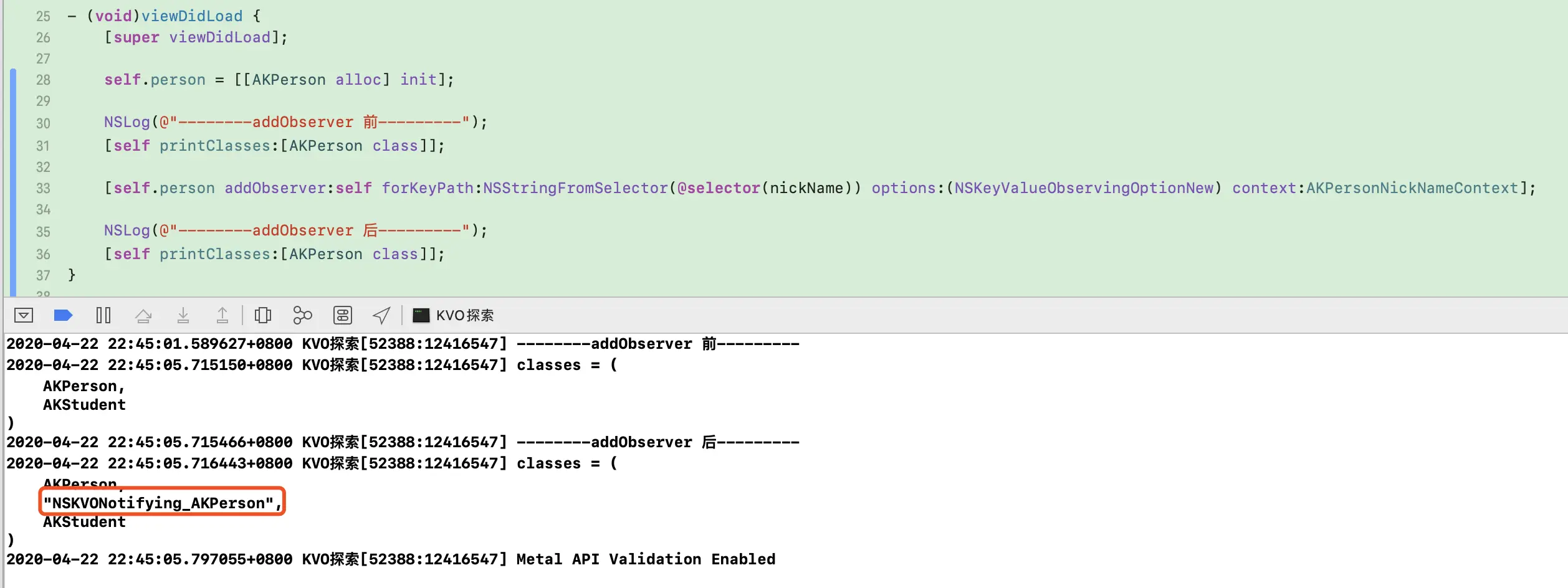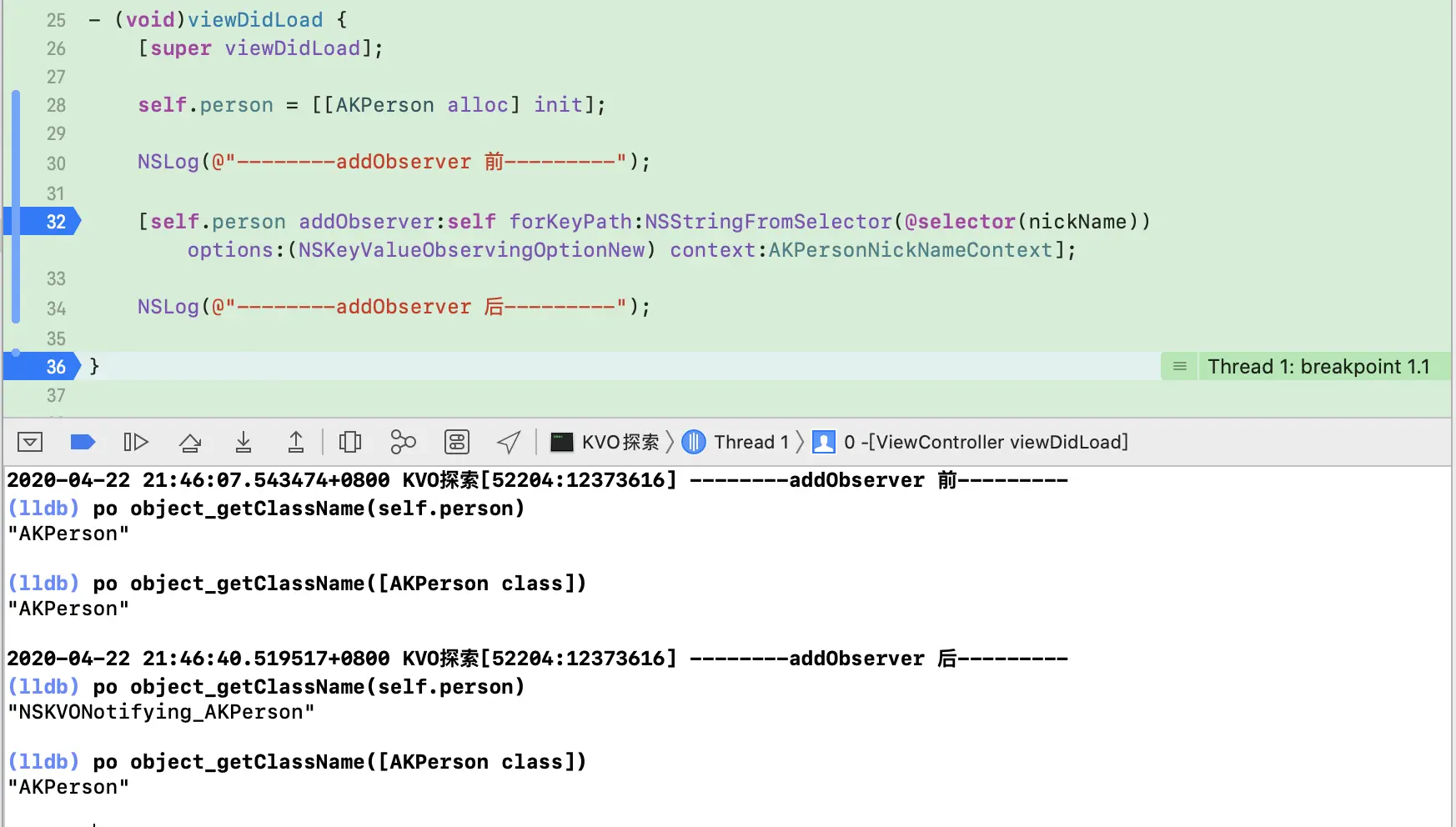 - 添加观察者之前:类对象为AKPerson,实例对象
