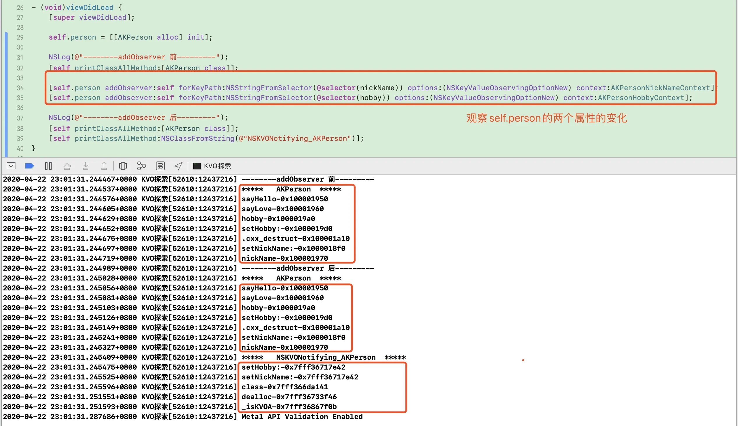 NSKVONotifying_AKPerson,实例对象self.person的isa由指向原始AKPerson类, 修改为指向中间类NSKVONotifying_AKPerson。