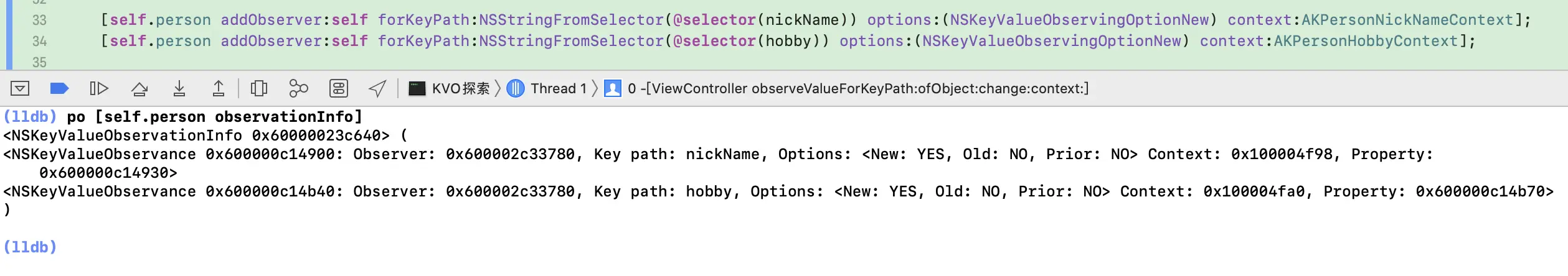 通过observationInfo命令,可以在 lldb 里查看一个被观察对象的所有观察信息。