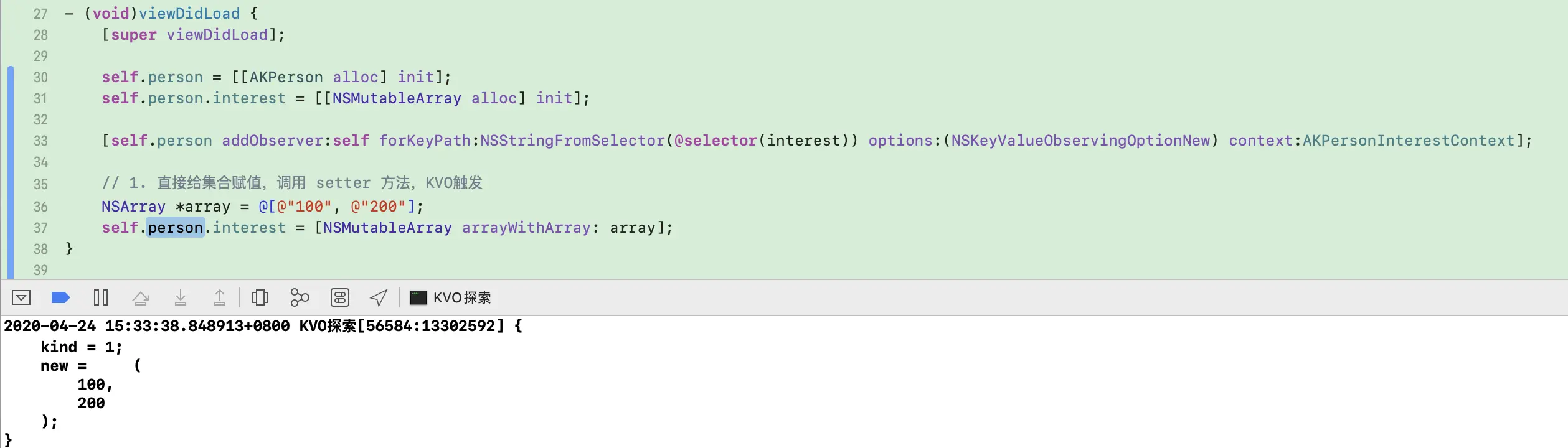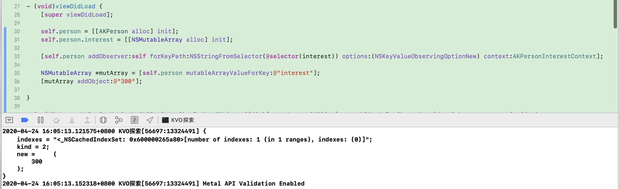 - 间接操作:在进行可变集合对象操作时,先通过key或者keyPath获取集合对象,然后再对集合对象进行add或remove等操作时,就会触发KVO的消息通知了。这种方式是实际开发中最常用到的。