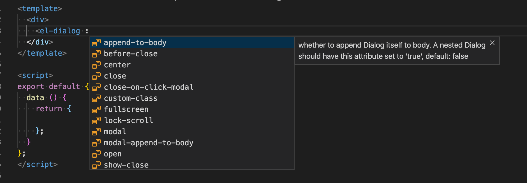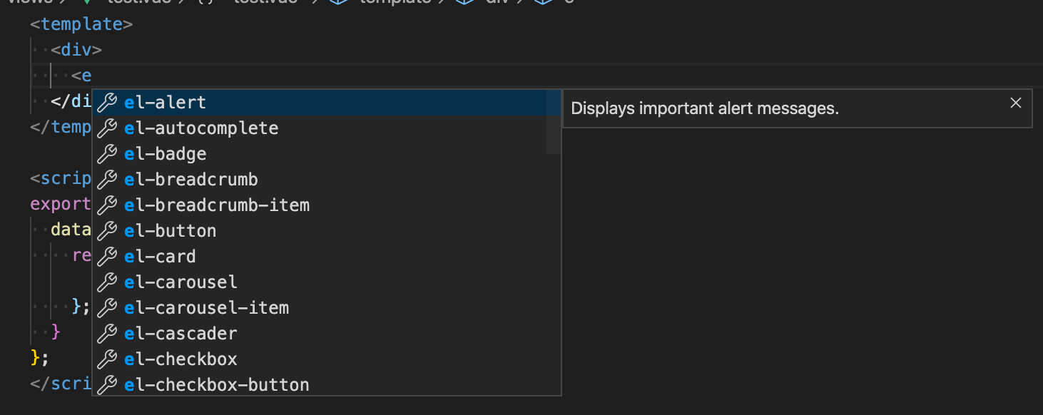 之前很长一段时间,我对 Vetur 的认知就只是 Vue 标签高亮提示而已,压根想不到他竟然会对 element-ui 进行提示支持。后来翻看他的文档之后,发现他的确是对 element-ui 进行支持的