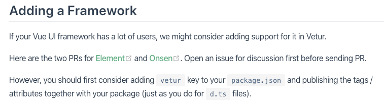 其实单看 element-ui 的组件库,其实看不出什么名堂,这也是为什么我花了很长一段时间也没有研究明白的原因。真相其实是,Vetur 对于 element-ui 做了支持。上面的 github 地址就是 element-ui 提示文件,Vetur 直接依赖了这两个文件,所以在 element-ui 组件当中不需要放上这两个文件。但是像我们这些小众的开发者,总不能要求 Vetur 插件开发者为我们的组件做一个支持吧。幸好,在查看 Vetur 的源码和参考国外的资料之后,我发现其实我们个人开发团队也能做代码提示。