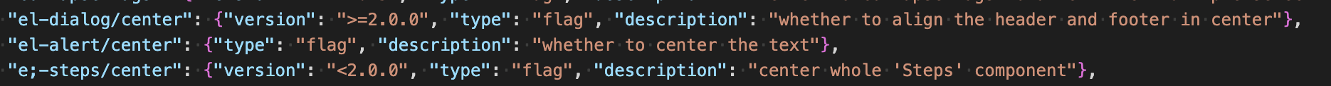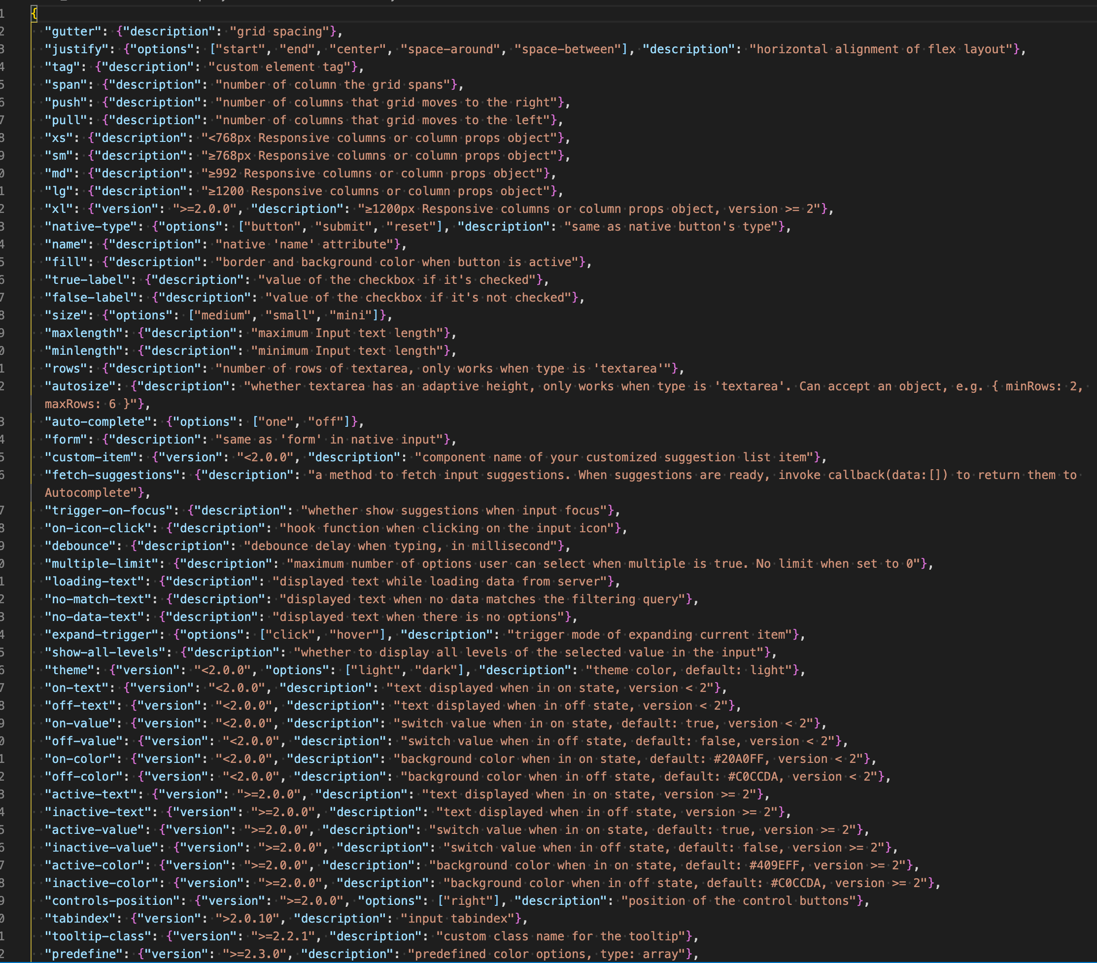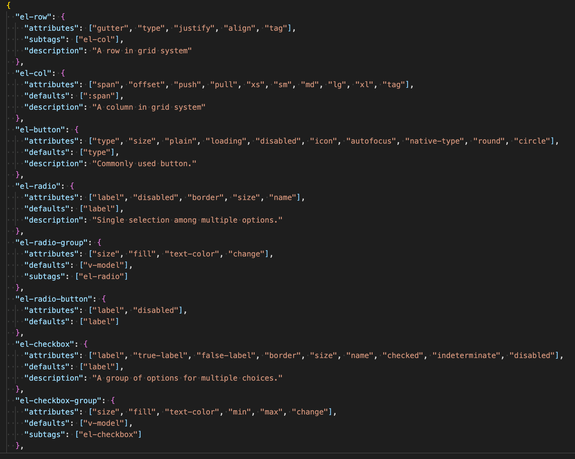 Tags 和 Attributes 其实分别是 2 个不同的 json 文件,下面就以 element-ui 的 element-tags.json 和 element-attributes.json 来说。由于也没有找到具体文档,下面说明仅供参考!!
