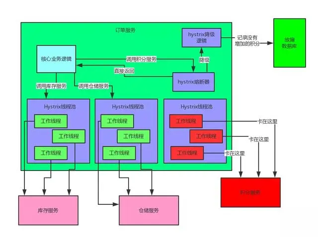 这时就轮到Hystrix闪亮登场了。Hystrix是隔离、熔断以及降级的一个框架。啥意思呢?说白了,Hystrix会搞很多个小小的线程池,比如订单服务请求库存服务是一个线程池,请求仓储服务是一个线程池,请求积分服务是一个线程池。每个线程池里的线程就仅仅用于请求那个服务。