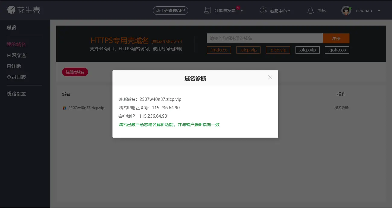 登录后可以看到主页面的三个功能. 我的域名, 目前就一个, 关注公众号获取的免费花生壳域名, 也可以购买, 如果你需要的话; 内网穿透就是支持外网访问内网的功能, 自诊断, 检查域名可用情况, 检查内网穿透服务可用情况; 选择内网穿透, 双击打开, 可以检查一下我的域名, 正常情况如图3-6 所示;