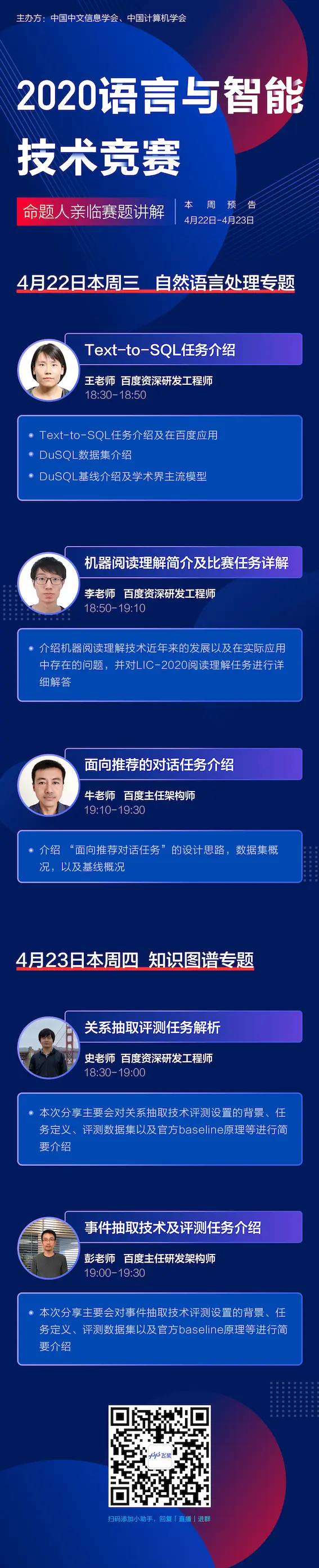 2020语言与智能技术竞赛火热报名中,全部训练数据和第一批测试数据已于3月31日发放,报名截至5月20日。今明两天晚6点半,干货满满的B站直播分享不容错过!