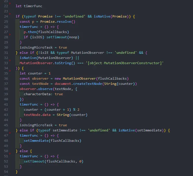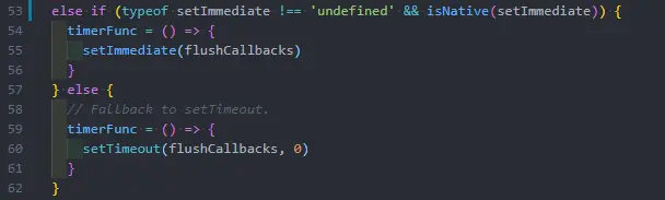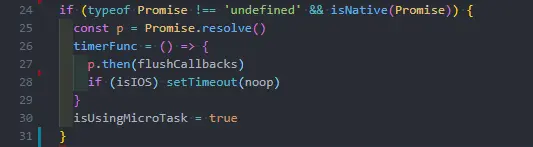 接着为函数赋值并给p.then设置为flushCallbacks函数,以及在IOS会导致Promise.then不会完全中断,所以需要做一些其他工作,例如处理计时器,因此我们可以“强制”通过添加空计时器来刷新微任务(microtask)队列。(noop根据路径找到后为一个空函数)