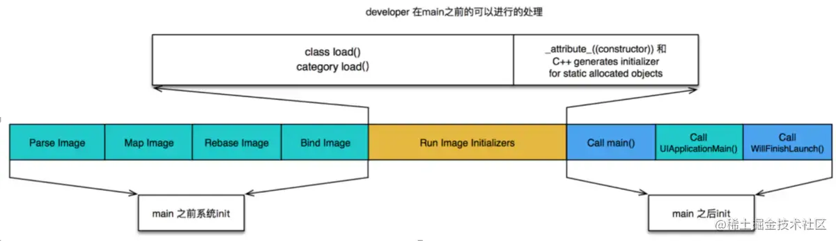2.初始化,包括了执行 +load() 方法、attribute((constructor)) 修饰的函数的调用、创建 C++ 静态全局变量。