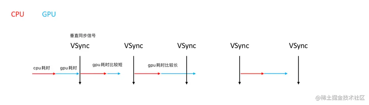 如上图所示,CPU计算耗时为红色部分,GPU为蓝色部分,当cpu计算结束时由GPU来渲染,如第一个所示,渲染结束时,垂直同步信号到来,渲染一帧画面到屏幕上,第二个区间,耗时比较短,在等待VSync信号到来在渲染,第三个区间,GPU耗时比较长,等到VSync信号到达时尚未渲染结束,此时还是展示的上一帧画面,一直等到下一次vsync信号到达时在渲染,这就造成了卡顿。