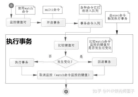当使用EXEC执行事务时,首先会比对WATCH所监控的键值对,如果没发生改变,它会执行事务队列中的命令,提交事务;如果发生变化,将不会执行事务中的任何命令,同时事务回滚。当然无论是否回滚,Redis都会取消执行事务前的WATCH命令。