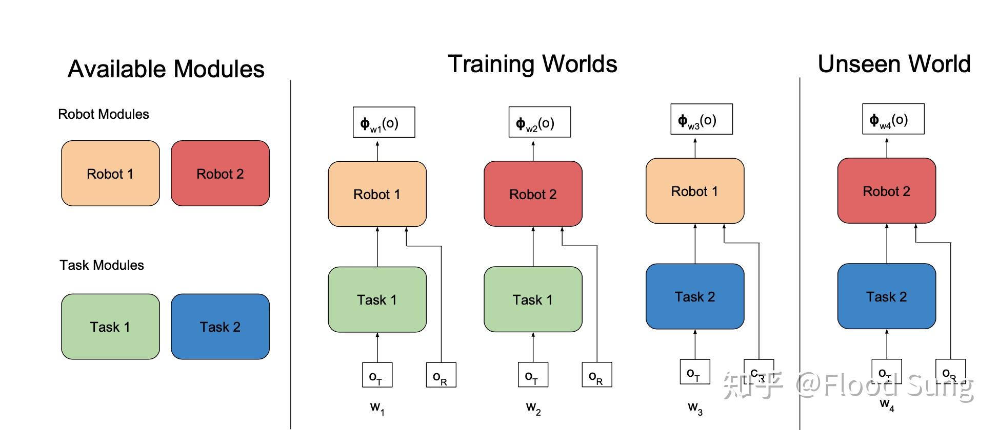 Motivation: 这篇文章是Modularity在机器人上的典型应用。有不同的task,同时有不同的robot,那么是不是可以针对task训练一个module,针对robot也训练一个module,两种module任意组合就可以实现不同的效果?